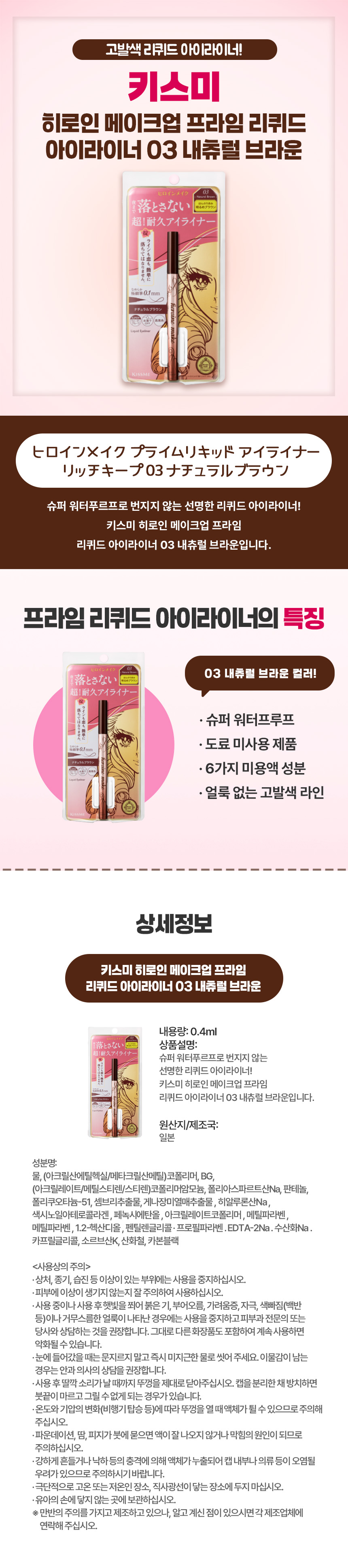 자연스럽게 또렷한 눈매엔, 일본 직구 키스미 히로인 메이크업 프라임 리퀴드 아이라이너 03 내츄럴 브라운