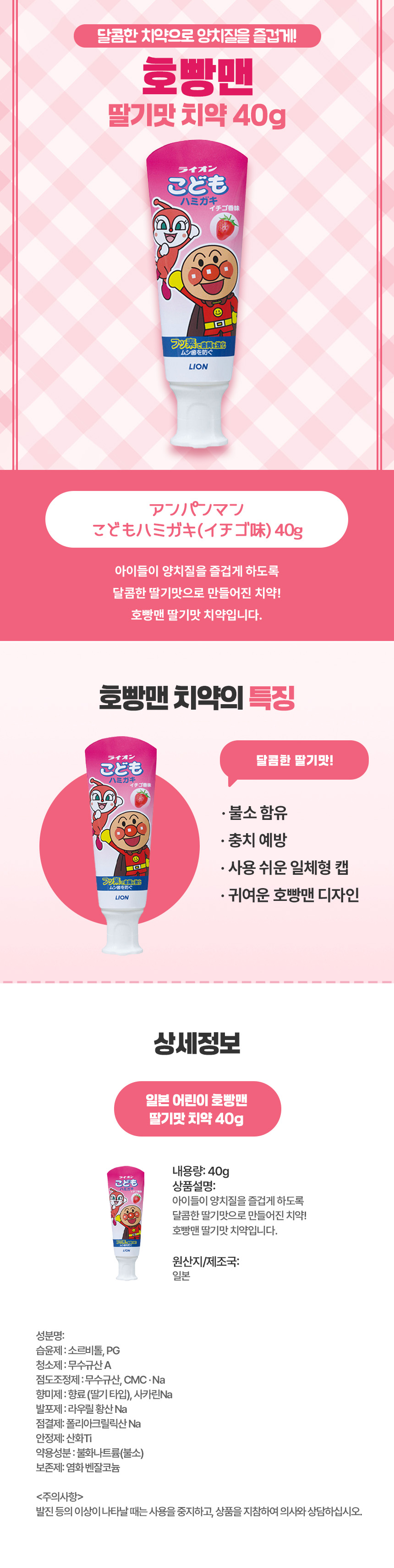 호빵맨 딸기맛 치약은 아이들이 양치질을 즐겁게 하도록 달콤한 딸기맛으로 만들어졌습니다. 삼켜도 안전한 성분과 충치 예방에 좋은 불소가 함유되어 있으며, 아이 혼자서도 사용하기 쉬운 휴대용 제품입니다.